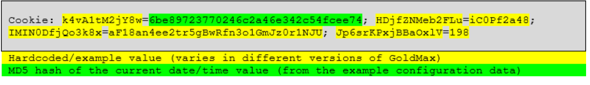 执行周期的下一步涉及在GoldMax及其C2服务器之间建立安全的会话密钥。GoldMax首先通过发送包含每个植入物唯一的自定义HTTP Cookie值的HTTP GET请求,从其C2服务器请求会话密钥。Cookie值由以下动态生成和硬编码的值组成: