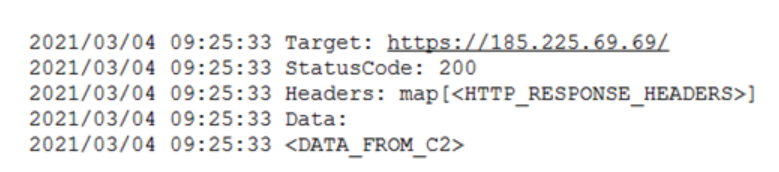 GoldFinder的另一种用Go语言编写的工具最有可能用作自定义HTTP跟踪器工具,用于记录数据包到达硬编码C2服务器所需的路由或跃点。启动后,恶意软件会发出对硬编码IP地址的HTTP请求(例如hxxps:// 185 [。] 225 [。] 69 [。] 69 /),并将HTTP响应记录到纯文本日志文件(例如loglog)中。 .txt在当前工作目录中创建)。GoldFinder使用以下硬编码标签将请求和响应信息存储在日志文件中: